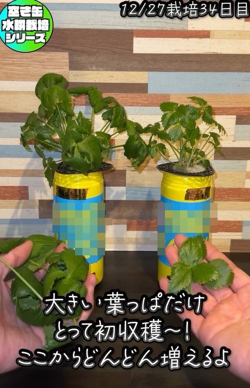 初収穫は、栽培をスタートした日から34日後の12月27日。ひとまず大きな葉だけを収穫し、小さな葉はそのまま残して成長を見守ります。
