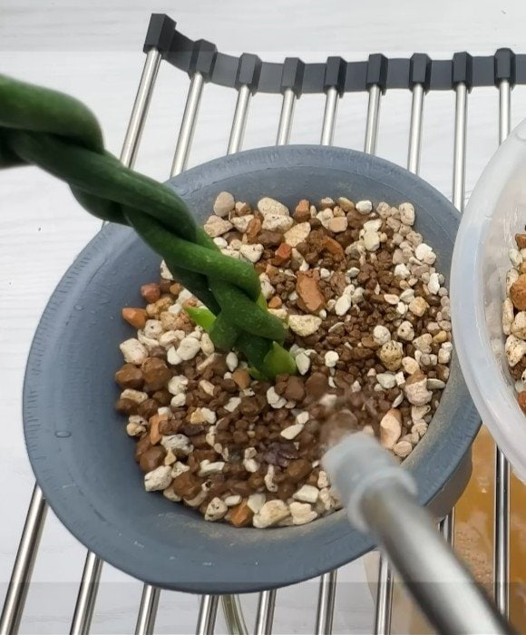 サンスベリアが安定するまで観葉植物用培養土を足したら、活力剤を加えた水をたっぷり与えます。