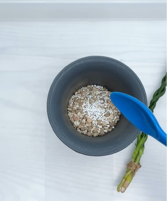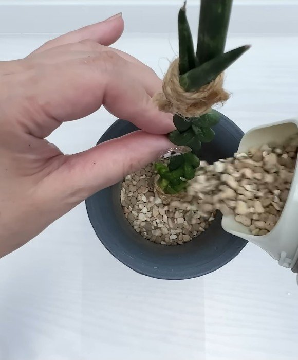 ここに三つ編み状にしたサンセベリア・スタッキーを麻紐で結んだまま入れ、周囲に「観葉植物用培養土」を足しましょう。