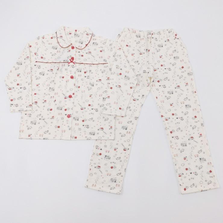 こちらがしまむらに登場した「猫柄のパジャマ」です。赤色のボタンとリボンがおしゃれでかわいいアイテムです。お家でのリラックス時間をより楽しくしてくれることでしょう。