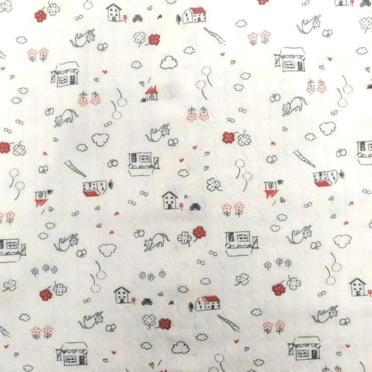 お散歩を楽しんでいる猫がたくさんデザインされています。花や綿毛、蝶なども一緒にデザインされているファンシーな一着です。