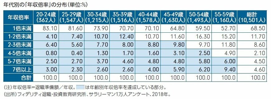 実際、2018年4月に実施したサラリーマン1万人アンケートで5歳刻みの退職準備額の年収倍率を分析してみると、20-30代の人は2-3割が途中経過の目標である1倍を達成していますが、60歳前後で6倍の目標を達成できている人は1割強に低下しています。子育て、住宅ローンなどの支出が多くなる時期に退職の準備に資金をつぎ込めない可能性もあるのでしょう。それでもできる限り自分の将来に対する投資だと考えて継続してほしいところです。継続することが大切です。