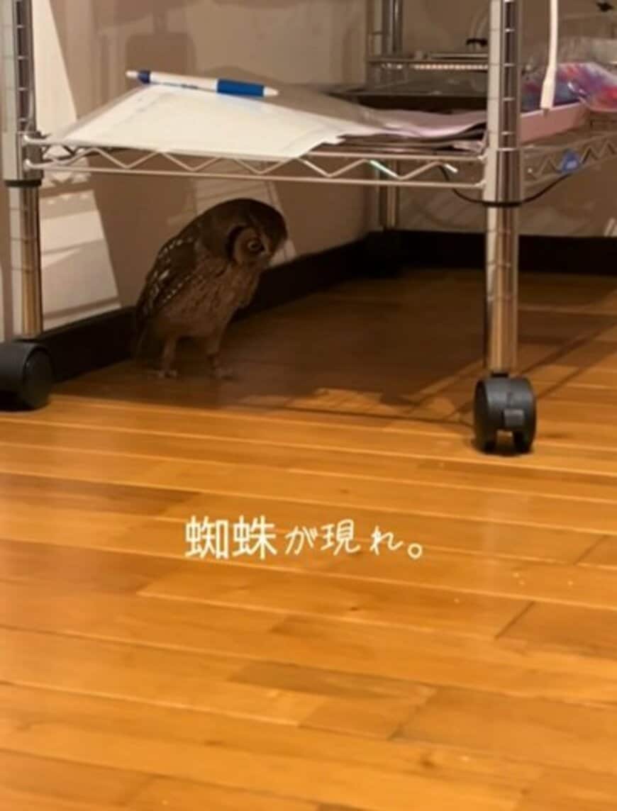 「スピックスコノハズクのカカオちゃん」が、クモを発見する動画がTikTokで話題です。投稿されたのは「@marumoku6」さん