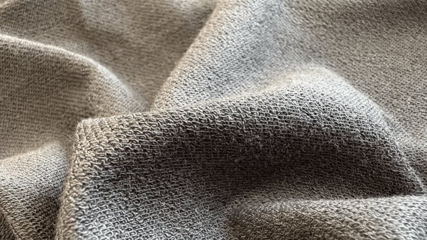 次に、デュアルニットの特徴を紹介します。従来のルームウェアタイプの素材は「ポリエステル90%、ポリウレタン10%」という構成でしたが、スウェットタイプでは「ポリエステル75%、綿15%、レーヨン10%」となっています。