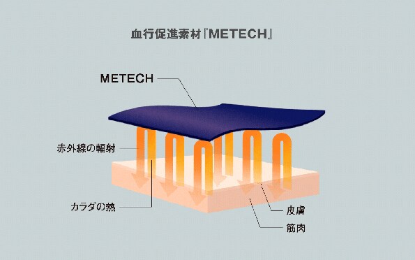 METECHは吸収した体温を遠赤外線として体に輻射することで、血行の促進を促します。遠赤外線血行促進用衣という扱いで一般医療機器として認可されており、多くのリカバリーウェアが溢れている市場においても、安心感の高い製品といえます。