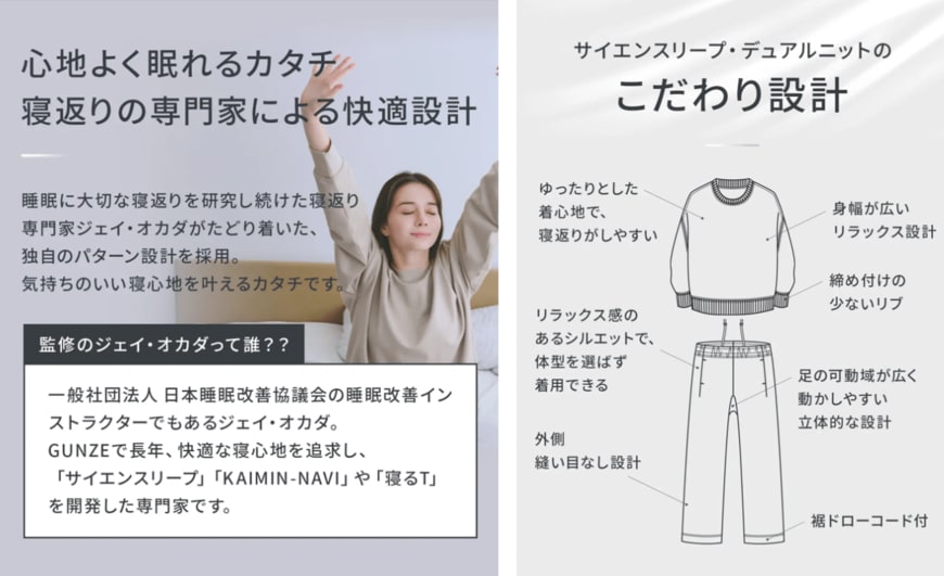 デュアルニットは素材以外にもこだわっているポイントがあります。それが「寝返りのしやすさ」です。快眠改善インストラクターのジェイ・オカダ氏がパターン設計を監修しており、気持ちよく寝返りが打てる工夫が凝らされています。