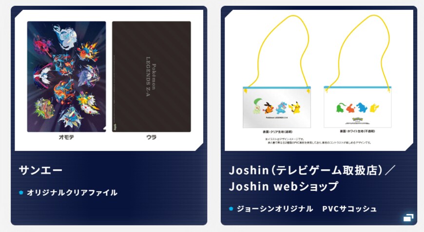 どこで買うのが正解?『ポケモンレジェンズZ-A』の早期特典は27種類!販売店による違いをチェック【Switch新作】 2025.10.15 08:00 公開 執筆者LIMOトレンド部 copy URL 目次[開く] 1. 【ポケモン新作】『Pokémon LEGENDS』シリーズとは 2. 【ポケモン新作】『Pokémon LEGENDS Z-A』はどんなストーリー? 3. 【ポケモン新作】店舗ごとに異なる早期特典をチェック!(1) 3.1 アニメイト 3.2 Amazon.co.jp 3.3 AmiAmi 3.4 イオン/イオンスタイル/イオンスーパーセンター(ゲーム取扱店) 3.5 イトーヨーカドー 3.6 au PAY マーケット ダイレクトストア 4. 【ポケモン新作】店舗ごとに異なる早期特典をチェック!(2) 4.1 エディオン 4.2 お宝創庫グループ 4.3 ゲーマーズ 4.4 ゲオ(ゲーム取扱店)/ゲオオンラインストア 4.5 サンエー 4.6 Joshin(テレビゲーム取扱店)/Joshin webショップ 5. 【ポケモン新作】店舗ごとに異なる早期特典をチェック!(3) 5.1 セブンネットショッピング 5.2 Game TSUTAYA加盟店 5.3 トイザらス 5.4 ドン・キホーテ/MEGAドン・キホーテ/MEGAドン・キホーテUNY/アピタ/ピアゴ(ゲーム取扱店) 5.5 ノジマ/ノジマオンライン 5.6 ビックカメラ/ソフマップ/コジマ(それぞれのゲーム取扱店のみ) 6. 【ポケモン新作】店舗ごとに異なる早期特典をチェック!(4) 6.1 ファミリーマート 6.2 古本市場/ふるいち 6.3 ポケモンセンター/ポケモンセンターオンライン 6.4 MrMax 6.5 ヤマダデンキグループ(ゲーム取扱店) 6.6 ヨドバシカメラ 7. 【ポケモン新作】店舗ごとに異なる早期特典をチェック!(5) 7.1 楽天ブックス 7.2 @Loppi/HMV 7.3 新星堂WonderGOO 8. 【ポケモン新作】共通の早期購入特典とダウンロード版特典もチェック 参考資料 4. 【ポケモン新作】店舗ごとに異なる早期特典をチェック!(2) ©2025 Pokémon. ©1995-2025 Nintendo/Creatures Inc. /GAME FREAK inc. 4.1 エディオン リストウォッチ(ダークカラー) 4.2 お宝創庫グループ 缶バッジ(32mm) ©2025 Pokémon. ©1995-2025 Nintendo/Creatures Inc. /GAME FREAK inc. 4.3 ゲーマーズ ランチョンマット 4.4 ゲオ(ゲーム取扱店)/ゲオオンラインストア B6リングノート ©2025 Pokémon. ©1995-2025 Nintendo/Creatures Inc. /GAME FREAK inc. 4.5 サンエー オリジナルクリアファイル 4.6 Joshin(テレビゲーム取扱店)/Joshin webショップ ジョーシンオリジナル PVCサコッシュ 5. 【ポケモン新作】店舗ごとに異なる早期特典をチェック!(3) < 2 3 4 5 6 > 関連タグ #ポケモン #任天堂 #Nintendo Switch 注目コンテンツ 働けなくなった時の備えはできている?人気の就業不能保険をチェック[PR] 上皮内がんも対象になるがん保険。1番人気のがん保険は?[PR] 【LIMOで懸賞】新しいプレゼントが続々登場中!最新情報はこちらから[PR]