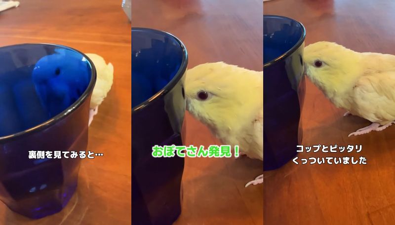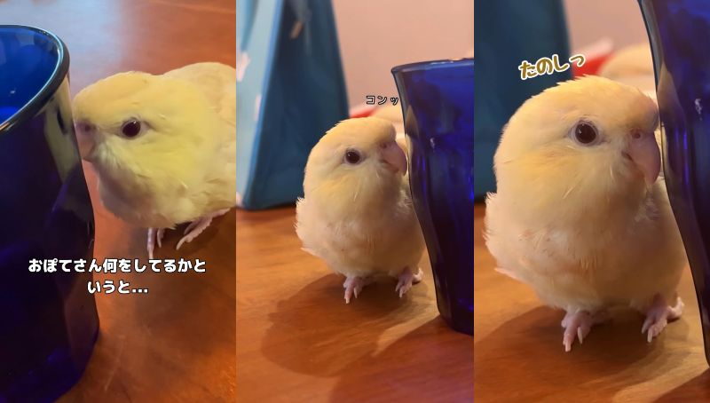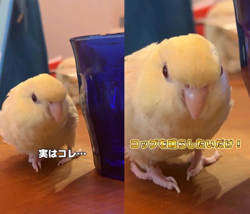 正面を向いて、コップ越しに飼い主さんを見つめてくれている...と思いきや、コップを「コツン」と鳴らしたかっただけだったようです(笑)