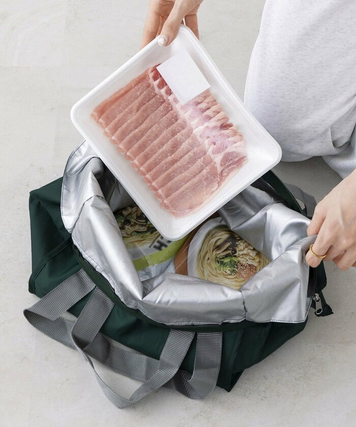 容量は約21.5L、耐荷重は約5kgと、見た目以上に大容量。内側はアルミコーティング素材で保冷効果もあり、食品の鮮度を保ちながら持ち帰ることができます。使わない時はゴムバンドでくるっと丸めてコンパクトになるので、普段使いのバッグにいつでも忍ばせておけます。