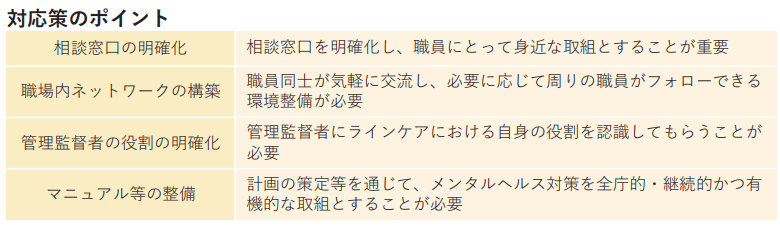 - 管理監督者の役割の明確化:管理監督者にラインケアにおける自身の役割を認識してもらうことが必要