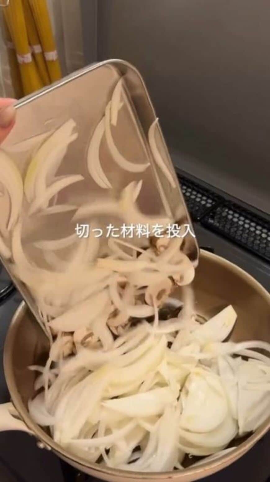まず、ご飯を炊いている間に、玉ねぎやマッシュルームをフライパンで炒めます。