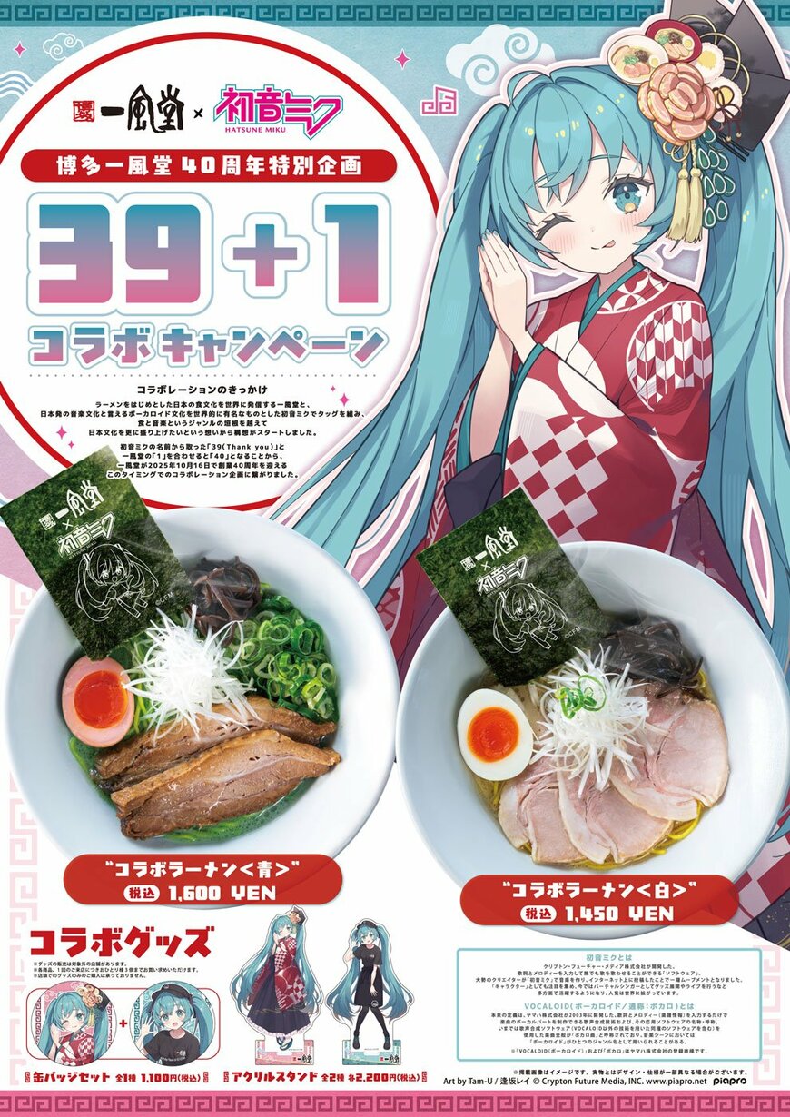 双方のコラボは食と音楽というジャンルの垣根を越えて、日本文化を更に盛り上げたいという想いから構想がスタート。初音ミクの名前から取った「39(Thank you)」と一風堂の「1」を合わせると「40」となるという理由から、今回のタイミングでの実施となりました。