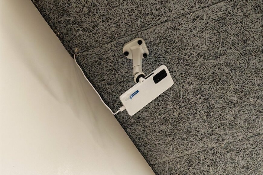 そこに収められていたのは、天井に取り付けられたスマートフォンらしき機器でした。ブラケットで固定されたカメラ付きの機器は充電ケーブルが常時接続された状態。