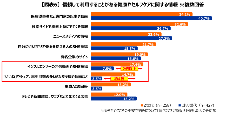 Z世代は健康に関する情報として「インフルエンサーの発信動画やSNS投稿」をミドル世代の2倍以上信頼しており、「いいねやシェア、再生回数の多いSNS投稿」も約4倍信頼して利用しています。