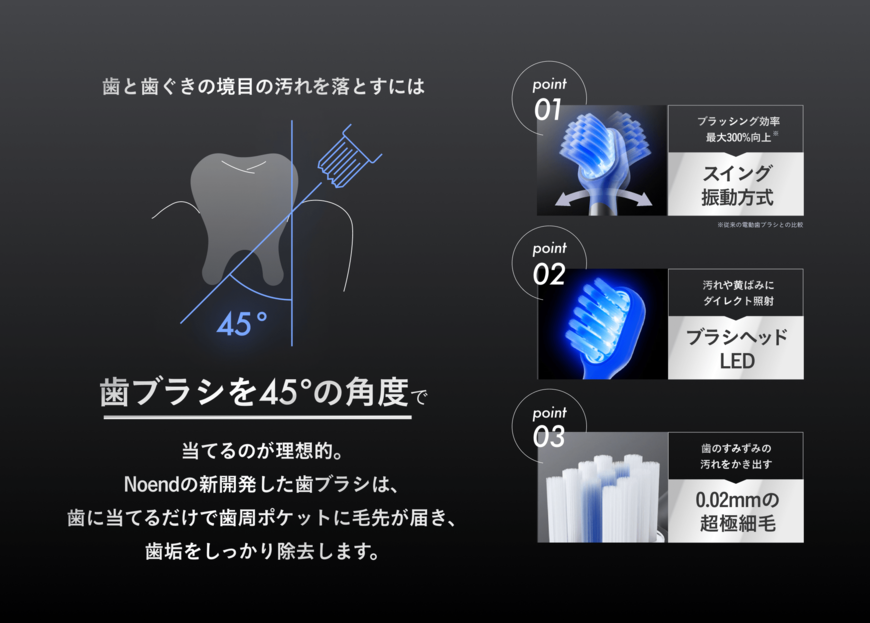 ブラッシング効率を大幅に高める特許技術「LEDワイドスイングテクノロジー」を搭載している点も、Noendの次世代電動歯ブラシの大きな魅力です。