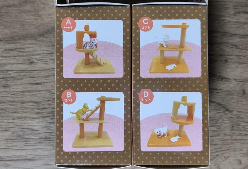 価格は1つ110円(税込)です。A・B・C・Dの4種類展開です。AとBには、「キャットハウス」と「猫のミニチュア」と「ハシゴ」がセットになっています。