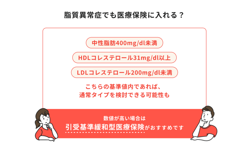 ただし、脂質異常症は心疾患のリスク要因となるため、入院歴がある場合は審査が厳しくなる傾向があります。