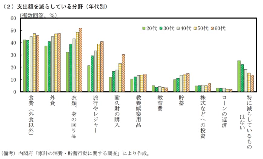 とくに「衣類、身の回り品」の支出を減らしている割合は、50代で50%近く、60代で50%超と高水準にあります。
