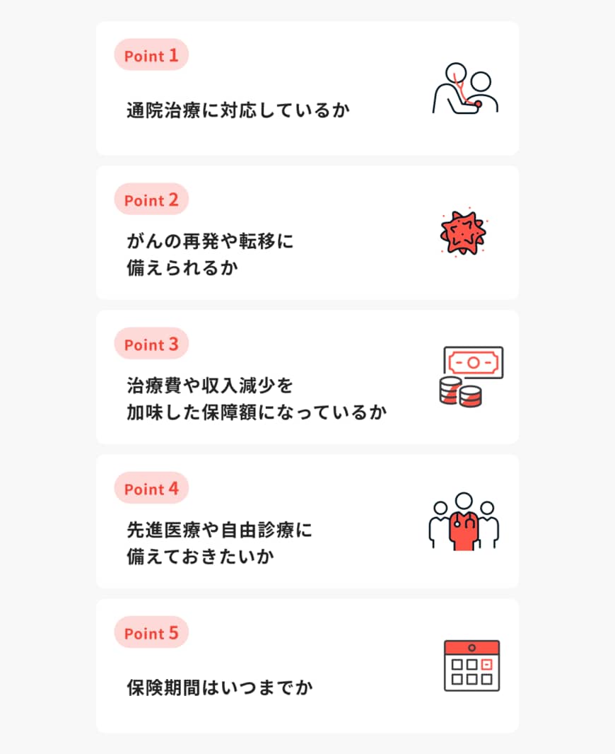 がんは再発や転移のリスクがある疾患のため、複数回の給付に対応した保険がおすすめです。診断一時金の複数回給付や、抗がん剤治療給付金の回数制限の有無を確認するようにしましょう。