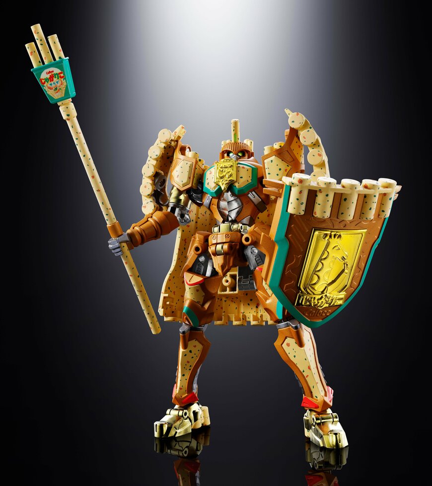 パーツを組み替えると、杖と盾、マントを装着したじゃがりこキングの「ロボットモード」の姿が顕現します。胸元と盾にはメッキパーツのエンブレムを装着しているなど、細かいデザインにもこだわっています。