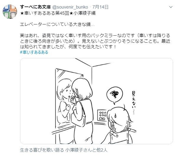 Twitterで話題の「エレベーターの鏡」についてツイ主さんに聞いてみた 2019.07.29 06:00 公開 執筆者衛澤 創 01/05 この写真の記事へ戻る 次の写真一覧へ copy URL 執筆者 衛澤 創 作家/ライター 主な執筆分野は漫画・アニメ・映画・ゲーム・アイドル歌謡・懐メロなど2~2.5次元のサブカルチャー。精神障害・性同一性障害・同性愛・虐待サバイバーの当事者で、これらについての記事を書いたり講演などもしています。1年中アロハで髭でつるつる坊主なのでよく怖がられますが、怖くないです。好きなものはねこ・甘いもの・変なもの。Twitter:@ezawa_sanjo あわせて読みたい