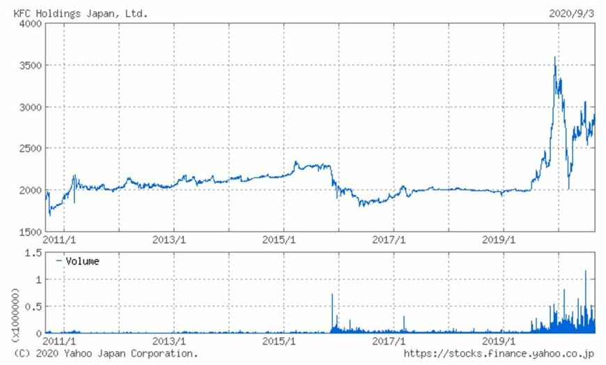 「勝ち組」になった日本ケンタッキー・フライド・チキン、2期連続最高益を見込む背景 2020.09.04 00:00 公開 執筆者葛西 裕一 日本KFCHDの過去10年の株価推移 01/01 この写真の記事へ戻る この写真の記事へ戻る 葛西 裕一 copy URL 執筆者 葛西 裕一 証券アナリスト 国立大学卒業後、国内・外資系の金融機関にて23年勤務後に独立。証券アナリストなどの職務を経験し、ファイナンシャルプランナー関連等の金融系資格を多数保有。専門は株式投資、貴金属投資、年金、相続、不動産。 あわせて読みたい