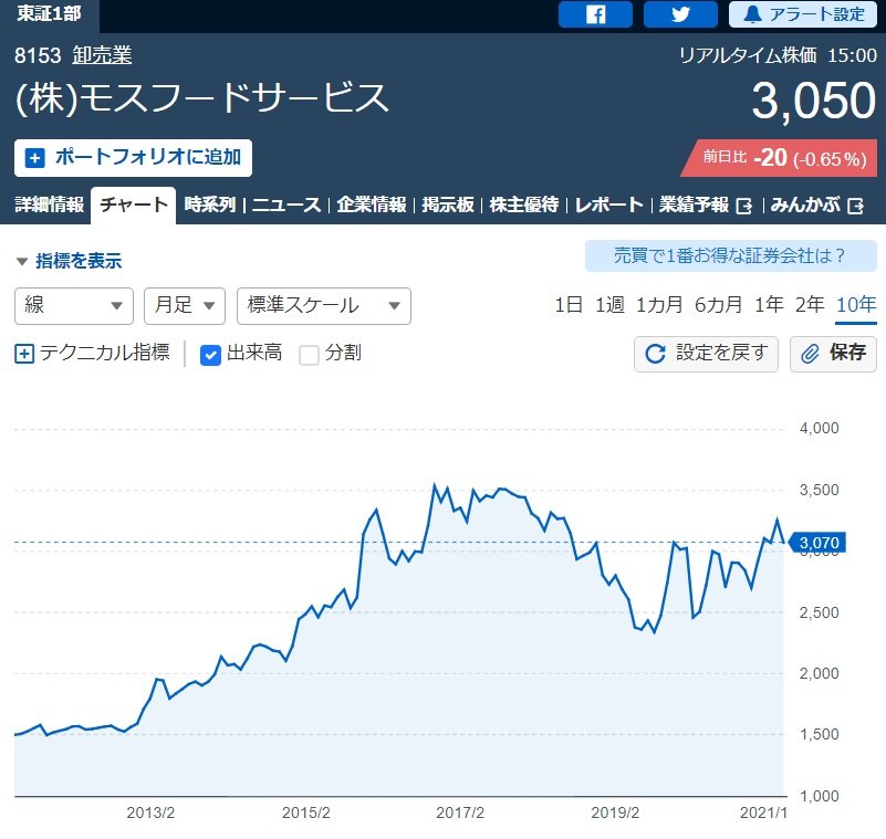 モスバーガー”攻め”の商品投入で復活中。モスFSの業績を見る 2021.04.26 10:00 公開 執筆者山口 伸 モスフードサービスの過去10年の株価推移 01/01 この写真の記事へ戻る この写真の記事へ戻る 山口 伸 copy URL 執筆者 山口 伸 研究者/コラムニスト 化学メーカー勤務の研究開発職。総合化学専攻 修士。平日は研究に没頭し、休日は資格を活かした副業と株式投資を行う。「くらしとお金の経済メディア LIMO」「株の窓口」に寄稿。ファイナンシャルプランナー2級、簿記2級。株式投資歴6年、趣味は街歩きと読書。 あわせて読みたい