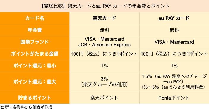 【クレカ】「楽天カード」と「au PAY カード」を比較、どちらがポイントを貯めやすいクレカか 2021.06.21 05:30 公開 執筆者藤原 悠喜 01/03 この写真の記事へ戻る 次の写真一覧へ copy URL 執筆者 藤原 悠喜 株式会社モニクルリサーチ 編集者/クレジットカード・住宅ローン・FX担当 専門学校を卒業後、複数のIT企業にて、Webメディアの立ち上げや運営に従事。SEOディレクターや広告運用など、Webマーケティング歴10年。現在は、クレジットカードのジャンルを中心にコンテンツの企画立案や執筆を行っている。これまで携わったクレジットカードのコンテンツは500以上。自身が使用するメインやサブのクレジットカードを定期的に入れ替え、サービス内容や使い勝手をユーザー視点で検証している。(2023年11月20日更新) あわせて読みたい