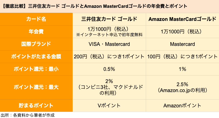 【ゴールドカード】「三井住友カード ゴールド」と「Amazon MasterCardゴールド」を徹底比較、どちらがポイントを貯めやすいクレカか 2021.06.22 05:30 公開 執筆者藤原 悠喜 01/03 この写真の記事へ戻る 次の写真一覧へ copy URL 執筆者 藤原 悠喜 株式会社モニクルリサーチ 編集者/クレジットカード・住宅ローン・FX担当 専門学校を卒業後、複数のIT企業にて、Webメディアの立ち上げや運営に従事。SEOディレクターや広告運用など、Webマーケティング歴10年。現在は、クレジットカードのジャンルを中心にコンテンツの企画立案や執筆を行っている。これまで携わったクレジットカードのコンテンツは500以上。自身が使用するメインやサブのクレジットカードを定期的に入れ替え、サービス内容や使い勝手をユーザー視点で検証している。(2023年11月20日更新) あわせて読みたい