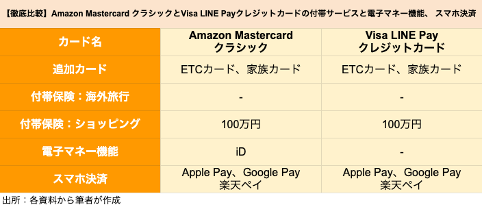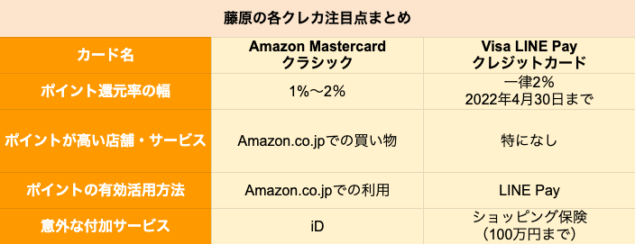 Amazon「Amazon Mastercard クラシック」とLINE「Visa LINE Pay クレジットカード」を比較、どちらがポイントを貯めやすいクレカか 2021.06.30 05:30 公開 執筆者藤原 悠喜 02/03 03/03 この写真の記事へ戻る 藤原 悠喜 copy URL 執筆者 藤原 悠喜 株式会社モニクルリサーチ 編集者/クレジットカード・住宅ローン・FX担当 専門学校を卒業後、複数のIT企業にて、Webメディアの立ち上げや運営に従事。SEOディレクターや広告運用など、Webマーケティング歴10年。現在は、クレジットカードのジャンルを中心にコンテンツの企画立案や執筆を行っている。これまで携わったクレジットカードのコンテンツは500以上。自身が使用するメインやサブのクレジットカードを定期的に入れ替え、サービス内容や使い勝手をユーザー視点で検証している。(2023年11月20日更新)