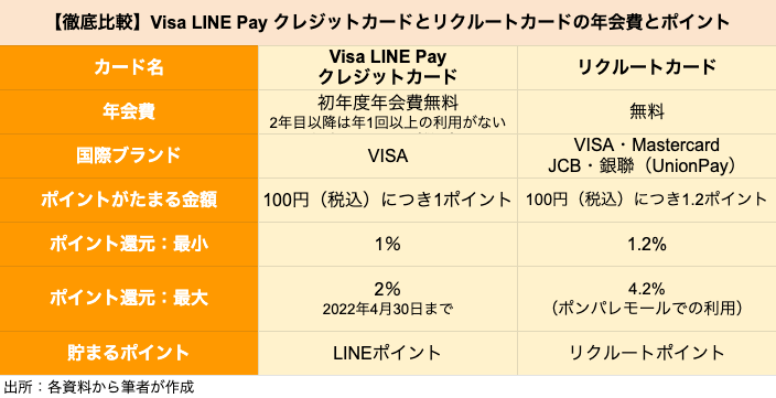 【クレカ比較】「Visa LINE Pay クレジットカード」と「リクルートカード」はどちらがポイントを貯めやすいクレカか 2021.07.12 05:30 公開 執筆者藤原 悠喜 01/03 この写真の記事へ戻る 次の写真一覧へ copy URL 執筆者 藤原 悠喜 株式会社モニクルリサーチ 編集者/クレジットカード・住宅ローン・FX担当 専門学校を卒業後、複数のIT企業にて、Webメディアの立ち上げや運営に従事。SEOディレクターや広告運用など、Webマーケティング歴10年。現在は、クレジットカードのジャンルを中心にコンテンツの企画立案や執筆を行っている。これまで携わったクレジットカードのコンテンツは500以上。自身が使用するメインやサブのクレジットカードを定期的に入れ替え、サービス内容や使い勝手をユーザー視点で検証している。(2023年11月20日更新) あわせて読みたい
