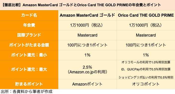【ゴールドカード】アマゾン「Amazon MasterCard ゴールド」とオリコ「Orico Card THE GOLD PRIME」を徹底比較、どちらがポイントを貯めやすいクレジットカードか 2021.08.07 05:30 公開 執筆者藤原 悠喜 01/03 この写真の記事へ戻る 次の写真一覧へ copy URL 執筆者 藤原 悠喜 株式会社モニクルリサーチ 編集者/クレジットカード・住宅ローン・FX担当 専門学校を卒業後、複数のIT企業にて、Webメディアの立ち上げや運営に従事。SEOディレクターや広告運用など、Webマーケティング歴10年。現在は、クレジットカードのジャンルを中心にコンテンツの企画立案や執筆を行っている。これまで携わったクレジットカードのコンテンツは500以上。自身が使用するメインやサブのクレジットカードを定期的に入れ替え、サービス内容や使い勝手をユーザー視点で検証している。(2023年11月20日更新) あわせて読みたい