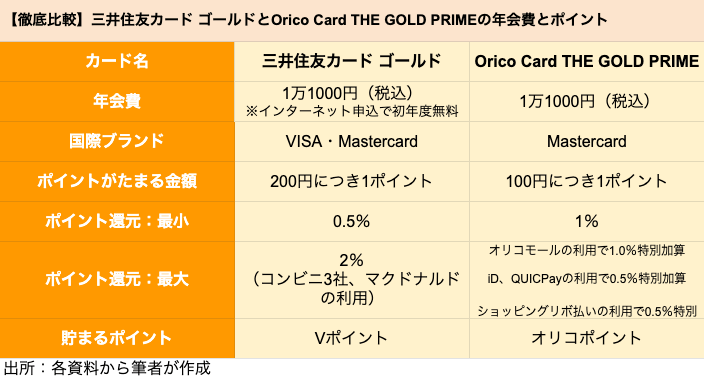 【ゴールドカード】「三井住友カード ゴールド」と「Orico Card THE GOLD PRIME」を徹底比較、どちらがポイントを貯めやすいクレジットカードか 2021.08.09 05:30 公開 執筆者藤原 悠喜 01/03 この写真の記事へ戻る 次の写真一覧へ copy URL 執筆者 藤原 悠喜 株式会社モニクルリサーチ 編集者/クレジットカード・住宅ローン・FX担当 専門学校を卒業後、複数のIT企業にて、Webメディアの立ち上げや運営に従事。SEOディレクターや広告運用など、Webマーケティング歴10年。現在は、クレジットカードのジャンルを中心にコンテンツの企画立案や執筆を行っている。これまで携わったクレジットカードのコンテンツは500以上。自身が使用するメインやサブのクレジットカードを定期的に入れ替え、サービス内容や使い勝手をユーザー視点で検証している。(2023年11月20日更新) あわせて読みたい