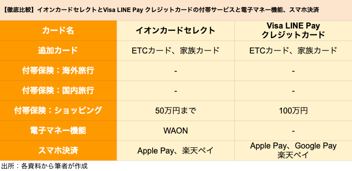 イオン「イオンカードセレクト」とLINE「Visa LINE Pay クレジットカード」はどちらがポイントを貯めやすいクレカか比較 2021.08.14 05:30 公開 執筆者藤原 悠喜 02/03 03/03 この写真の記事へ戻る 藤原 悠喜 copy URL 執筆者 藤原 悠喜 株式会社モニクルリサーチ 編集者/クレジットカード・住宅ローン・FX担当 専門学校を卒業後、複数のIT企業にて、Webメディアの立ち上げや運営に従事。SEOディレクターや広告運用など、Webマーケティング歴10年。現在は、クレジットカードのジャンルを中心にコンテンツの企画立案や執筆を行っている。これまで携わったクレジットカードのコンテンツは500以上。自身が使用するメインやサブのクレジットカードを定期的に入れ替え、サービス内容や使い勝手をユーザー視点で検証している。(2023年11月20日更新) あわせて読みたい