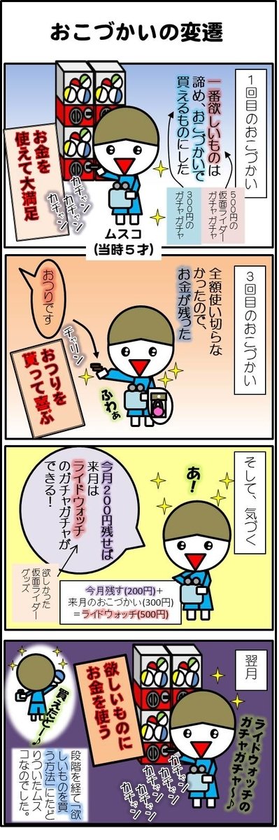 【参考になる…】5歳の子供に“お小遣い”を渡すようにしたら起きたこと、描いた漫画に注目 2021.10.15 10:00 公開 執筆者増田 雄三 02/02 この写真の記事へ戻る 増田 雄三 copy URL 執筆者 増田 雄三 記者/編集者 1980年生まれ、江戸川大学卒。モバイルコンテンツディレクターとして勤務した後、2008年に株式会社マイナビに入社。マイナビニュースにて記事広告の制作、広告営業、新規収益企画を経てライフスタイル情報を扱う編集者として従事。ツイッターやインスタグラムなどのSNSからネタを拾って記事を作ることが得意。新しいことに手を出したがる気質で、TikTokのフォロワーが2800人を超えた。 あわせて読みたい