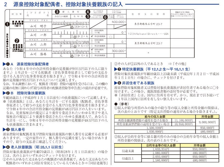 年末調整で「記入漏れしやすいポイント」をわかりやすく解説 申告漏れしやすいポイントつき 2022.12.03 18:10 公開 執筆者舟本 美子 02/06 03/06 出所:国税庁「令和4年分 給与所得者の扶養控除等申告書の記載例」 04/06 出所:国税庁「令和4年分 給与所得者の基礎控除申告書 兼 給与所得者の配偶者控除等申告書 兼 所得金額調整控除申告書」 05/06 出所:国税庁「令和4年分 給与所得者の保険料控除申告書」 06/06 出所:国税庁「給与所得者の(特定増改築等)住宅借入金等特別控除申告書兼(特定増改築等)住宅借入金等特別控除計算明細書」 この写真の記事へ戻る 舟本 美子 copy URL 執筆者 舟本 美子 2級ファイナンシャル・プランニング技能士(FP2級) 2級ファイナンシャル・プランニング技能士。会計事務所で10年、保険代理店や外資系の保険会社で営業職として14年勤務したのち、FPとして独立。ひとりひとりのお金に対する価値観を大事にしながら、ムリのない節約術を提案している。他のメディア媒体でも、お金に関する記事の執筆を行う。読者がすっと理解できるよう、文章の構成や表現などを意識している。LIMO編集部では、お金やペットの記事を執筆。自宅では、3匹の猫(12歳~19歳)と暮らしており、猫の健康管理や介護は得意分野。趣味は、落語、宝塚。愛読書は、P・G・ウッドハウスのジーヴスシリーズ(2023年11月20日更新)。 あわせて読みたい