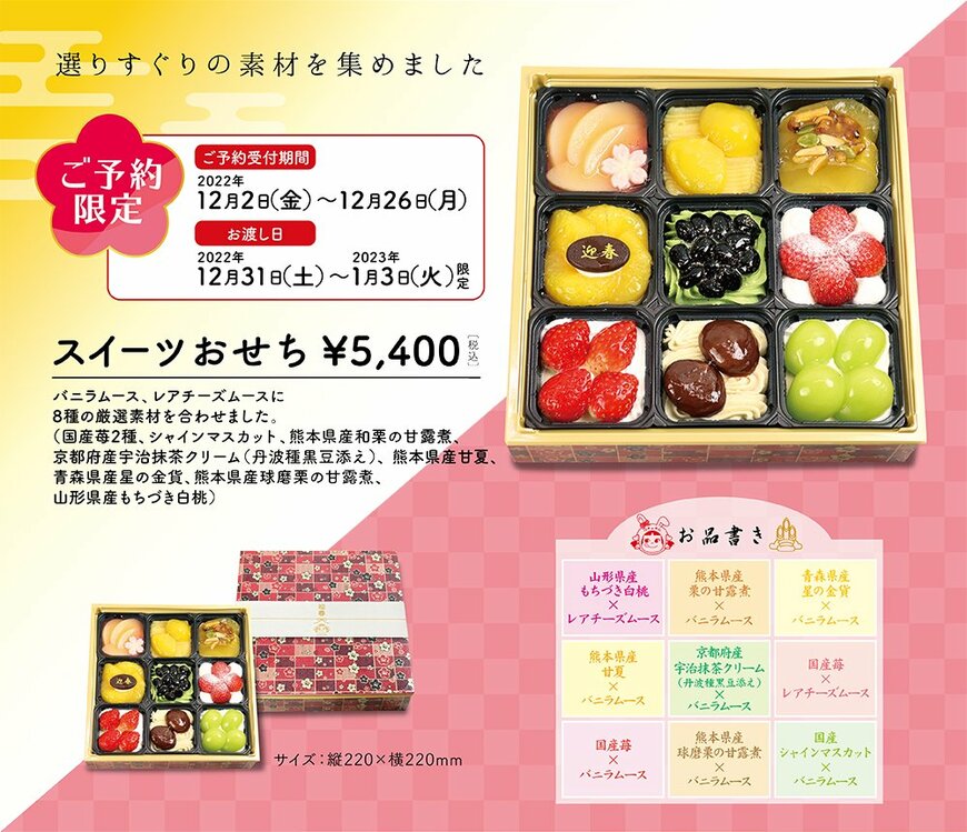 毎年人気【不二家】「スイーツおせち」色とりどりで可愛い。手土産にも 2022.12.26 20:45 公開 執筆者中川 雅美 02/07 03/07 04/07 05/07 画像出典:すべて「不二家公式」 06/07 07/07 画像出典:すべて「不二家公式」 この写真の記事へ戻る 中川 雅美 copy URL 執筆者 中川 雅美 株式会社モニクルリサーチメディア編集本部 編集者 ファッション雑誌、ウェブメディアの編集者として15年キャリアを積む。現在、トレンドを先読みする視点を活かし、ファッションやライフスタイルのメディアで編集者として活躍する。 LIMOでは、「ワークマン」「しまむら」「カルディ」「ハニーズ」「ディーン&デルーカ」など、ヒット記事を多数生みだし、ブランドの広報からも信頼が厚い。 あわせて読みたい