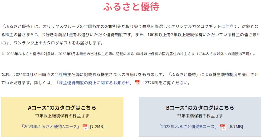 オリックス(8591)の株「1年前に買った人」のトータル・リターンはいくらか【株主優待・配当金・株価】(2023年8月2日終値ベース) 株式投資の企業別年間リターン解説シリーズ 2023.08.03 06:00 公開 執筆者加藤 聖人 02/04 03/04 出所:オリックス株式会社「株主優待について」 04/04 出所:オリックス株式会社「配当方針・配当状況」 この写真の記事へ戻る 加藤 聖人 copy URL 執筆者 加藤 聖人 2級ファイナンシャル・プランニング技能士(FP2級) 2級ファイナンシャル・プランニング技能士(FP2級)、一種外務員資格(証券外務員一種)、生命保険募集人。証券会社で約8年間、株式や投資信託、生命保険等の販売に携わる。退職後はフリーライター兼個人投資家として活動。金融ジャンルの記事を中心に執筆しつつ、日々のマーケット動向も注視している。 あわせて読みたい